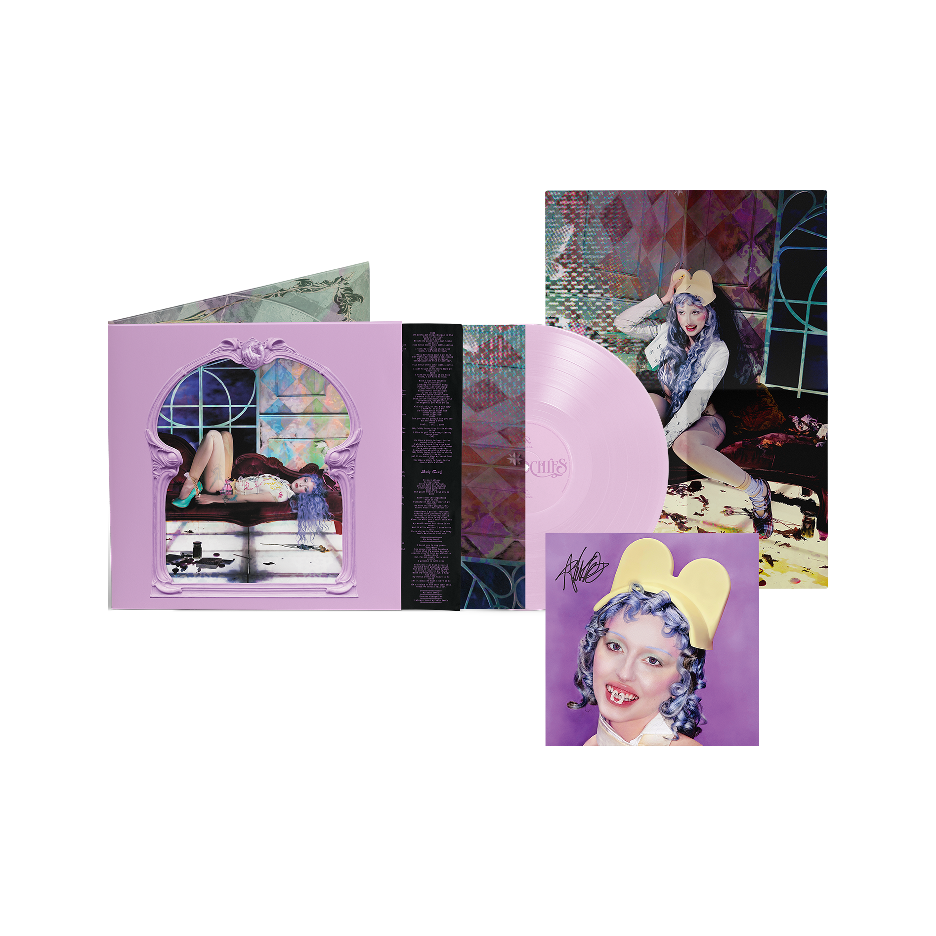 'Smoochies' on opaque pastel purple 12" vinyl, in a die-cut gatefold sleeve with exclusive artwork, printed inner bag, 12 panel folding poster and sticker sheet. Includes a special insert signed by Ashnikko. Exclusive to the official store.